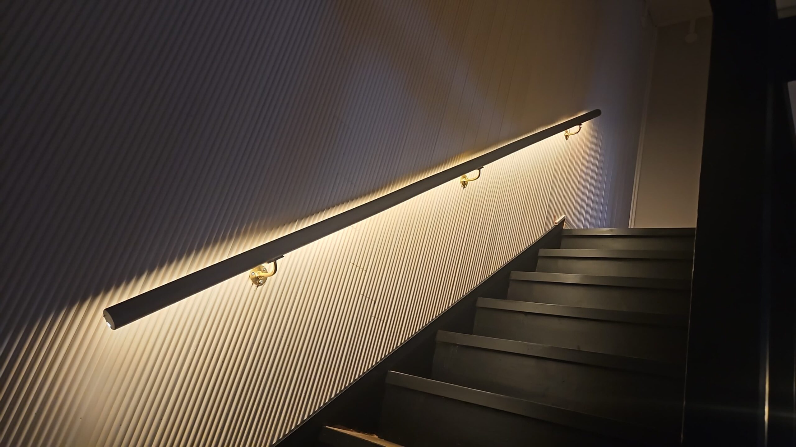 Valokuitu upotettiin kaiteeseen, jolloin valaistus toimii tunnelmavalaistuksena sekä hyvänä valaistuksena portaikossa.